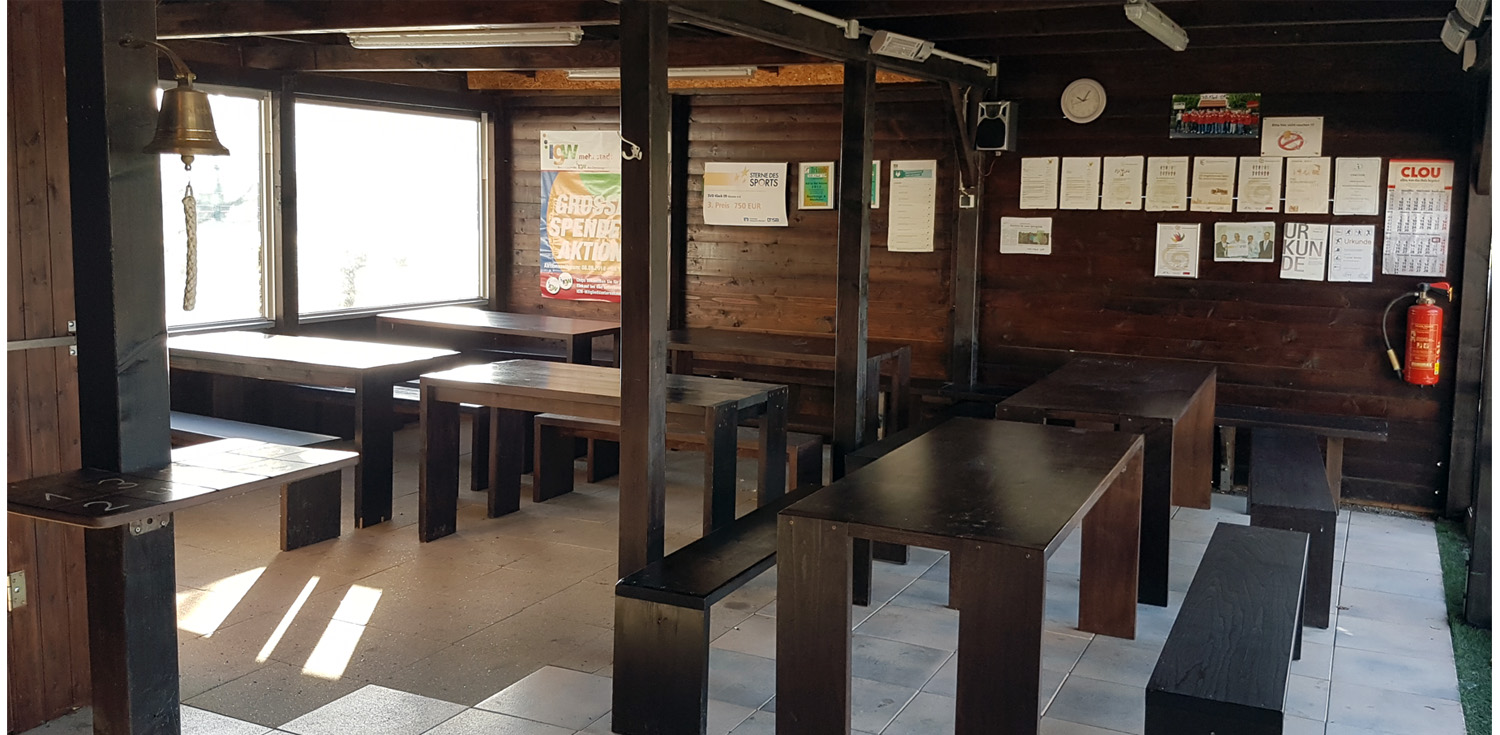 Die Anlage verfügt über ein Boule-Zelt mit drei Bahnen, in dem auch bei schlechtem Wetter und in dunklen Abendstunden gespielt werden kann.