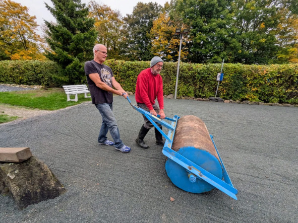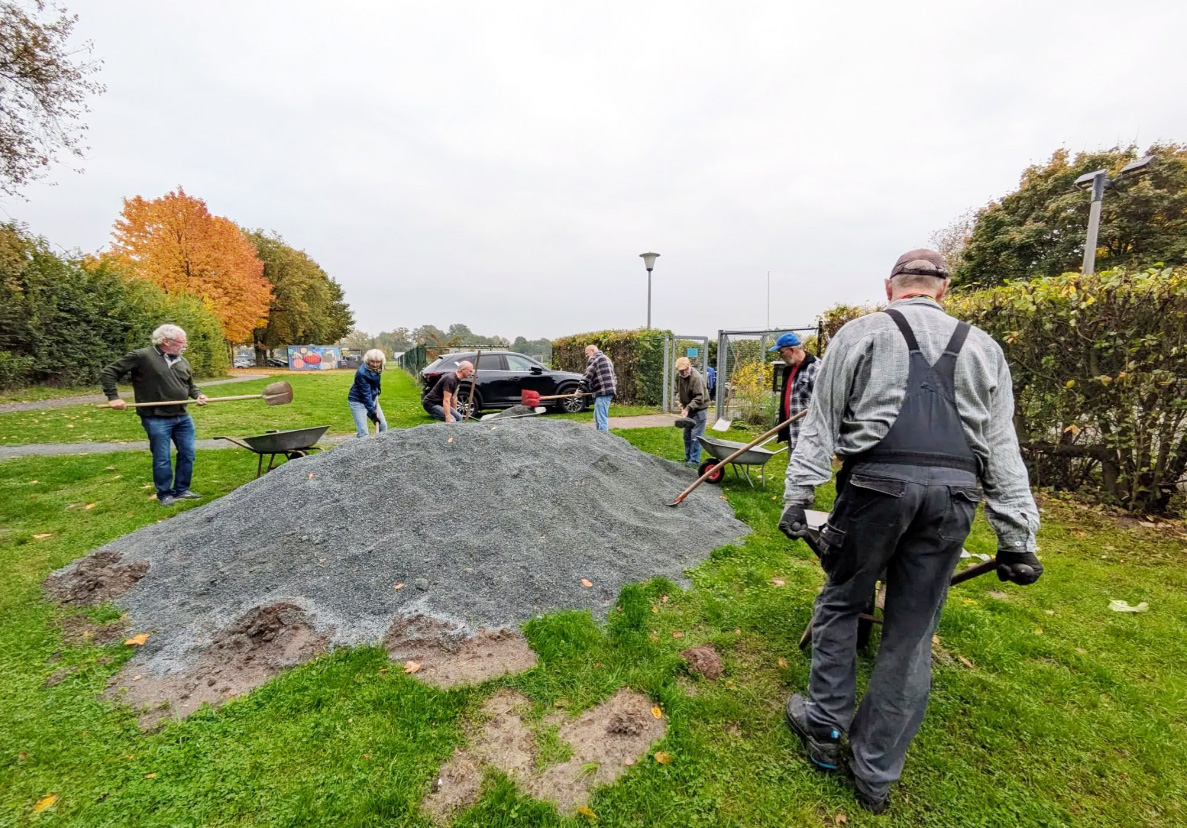 In gänzlich neuem Gewand präsentiert sich die Boule-Anlage des SC Gremmendorf am Hohen Ufer. Am Anfang war ein großer Berg Split und viele fleißige und zupackende Hände. Schubkarre um Schubkarre wurde heran gekarrt, der Split auf verschiedenen Flächen gleichmäßig verteilt und anschließend gewalzt.